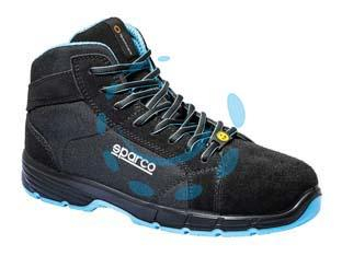 tomaia suede resistente all'abrasione e nylon idrorepellente - fodera interna tessuto 3D microforato traspirante - soletta removibile antistatica in poliuretano a bassa densità con termoformatura ergonomica - soletta antiperforazione fibra tessile ultraleggera perforazione-zero (PS) - puntale vetroresina amagnetico, isolante, resistente a 200J - suola antistatica antiscivolo iniettata in poliuretano bi-densità con assorbimento di energia sul tallone SR+FO - leggere e durevoli - colore: nero-azzurro