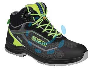 tomaia speciale materiale anti abrasione rigenerato Sparco FULL EFFICIENCY con rinforzo in HF su punta, occhiello specifico per rapido sfilamento - fodera interna tessuto 3D microforato traspirante - soletta removibile antistatica in poliuretano a bassa densità con termoformatura ergonomica - soletta antiperforazione fibra tessile ultraleggera perforazione-zero (PS) - puntale vetroresina amagnetico, isolante, resistente a 200J - suola antistatica antiscivolo iniettata in poliuretano bi-densità con assorbimento di energia sul tallone + LG - leggere, ecosostenibili e resistenti - secondo paio di lacci incluso - colore: nero-verde